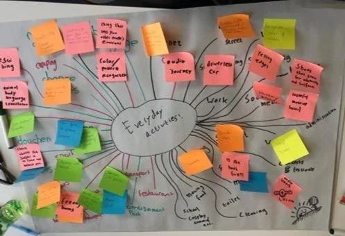 We interviewed a blind man, to get to know what the difficulties of being blind are. We created a new mind map to go deep with different kinds of blindness. Using post-its we put ideas/solutions to the kind of blindness that they matched. However, we got a bit stuck. Therefore, we tried to put ourselves in the shoes of the blind by thinking about daily activities of our own, that a blind person might struggle with. Again we used post-its to put possible solutions on top of the found problems. It appealed to us that the social interaction is a subject that is hard for the blind and can be improved. So we did some role playing to find struggles for blind people while playing games. We also did some research in what kind of games already exist. Then we started sketching to gain more ideas.